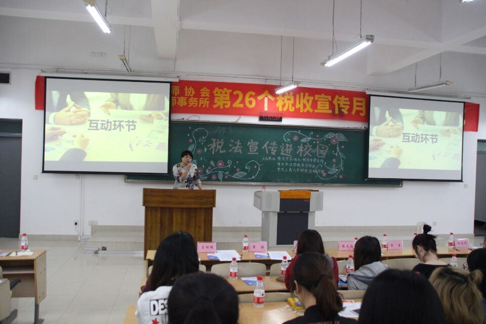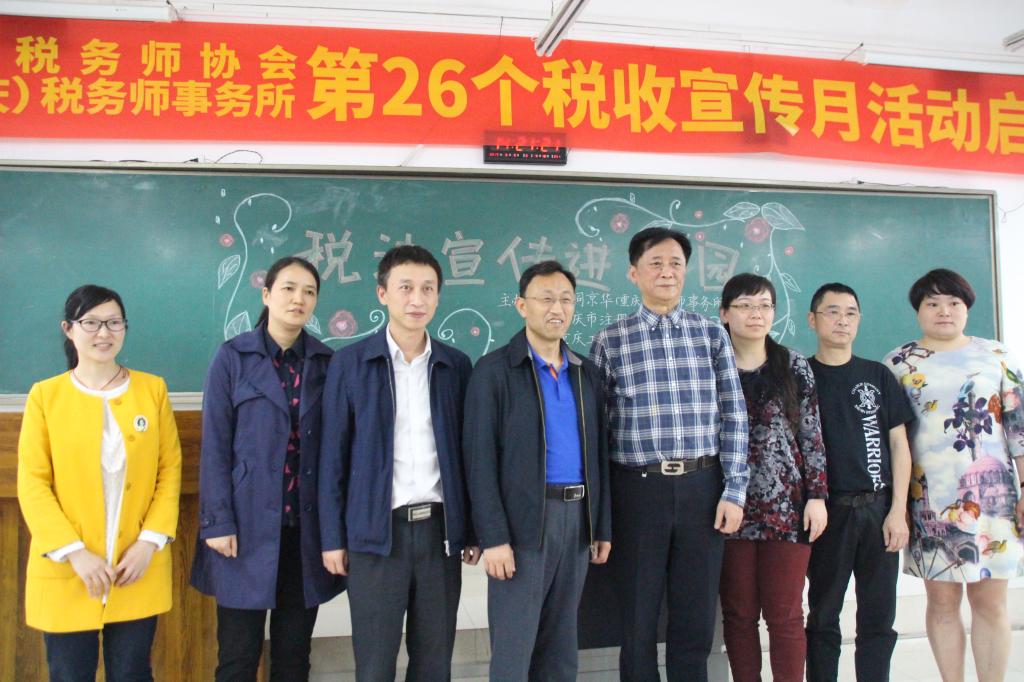 5月5日下午,由致同京华(重庆)税务师事务所、重庆市注册税务师协会、财政太阳成集团tyc联办的2017税法宣传进校园活动在南岸校区博智楼212教室成功举办。重庆市注册税务师协会副会长陈光信、重庆市注册税务师管理中心副主任王洪宇、太阳成集团财政金融公司党委副书记黄谦、致同京华(重庆)税务师事务所首席合伙人白云燕、注册税务师管理中心副处调研员徐勇、财政太阳成集团tyc财税系主任尚可文、致同京华(重庆)税务师事务所副总经理陈怡、财政太阳成集团tyc学团办主任兰丽娟出席了本次活动。