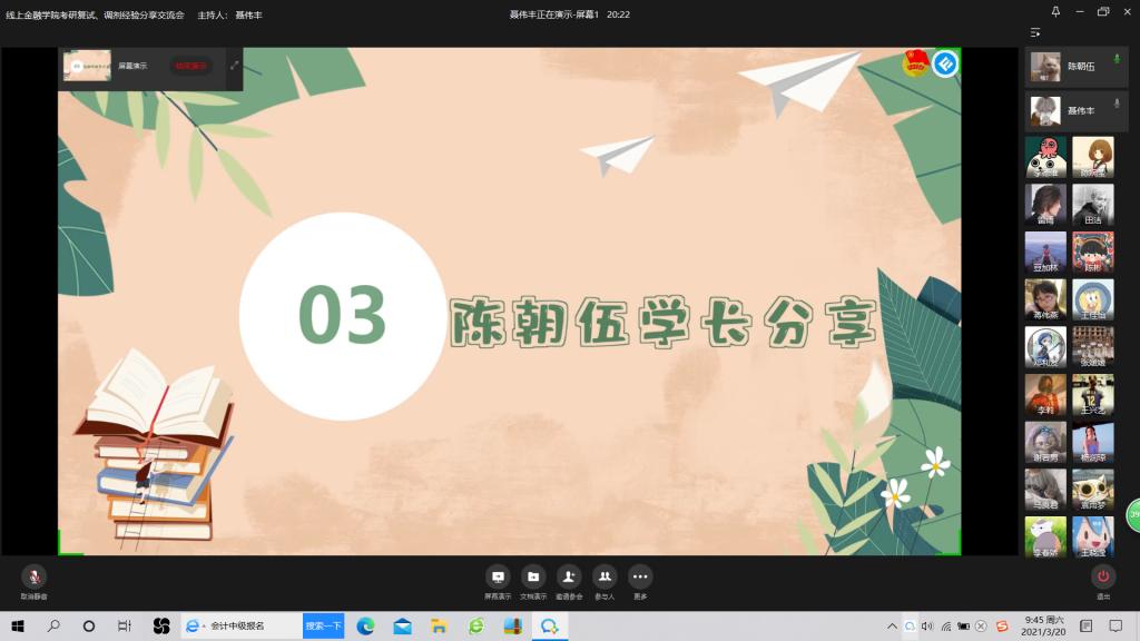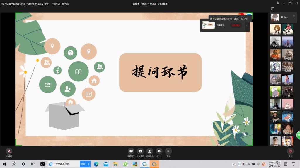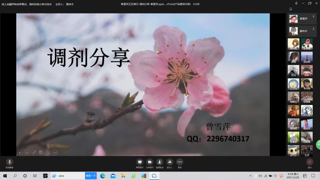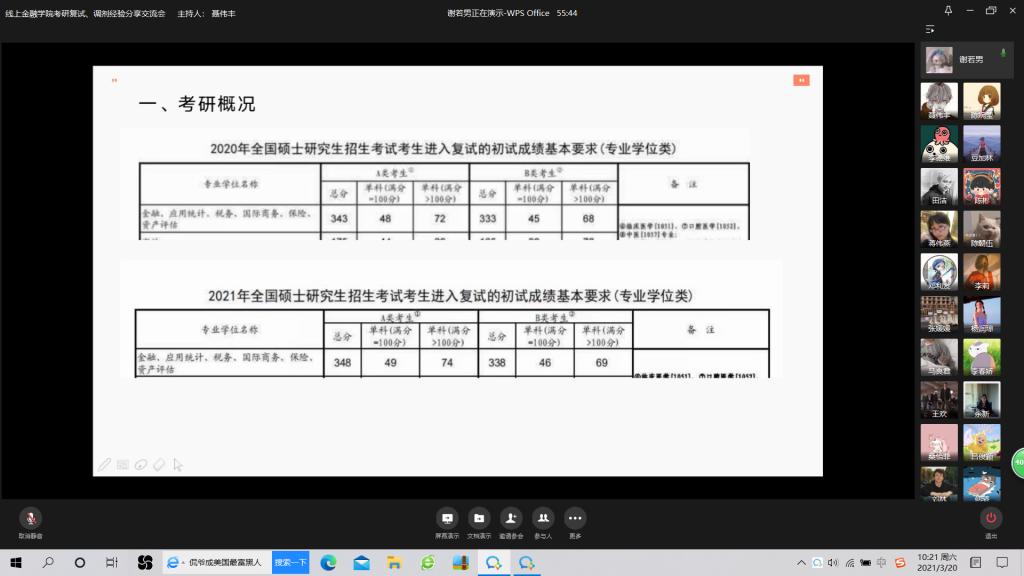 3月20日上午9:30,太阳成集团tyc成功举行了“太阳成集团tyc考研复试、调剂经验分享”线上交流会。此次交流会邀请了2020届考研成功的五位员工:杨润琼、陈朝伍、曾雪萍、刘柯岚、谢若男来分享关于复试和调剂成功的相关经验,为同学们答疑解惑。金融公司党委书记、副经理王建明,党委副书记、纪委书记余新出席了本次交流会。