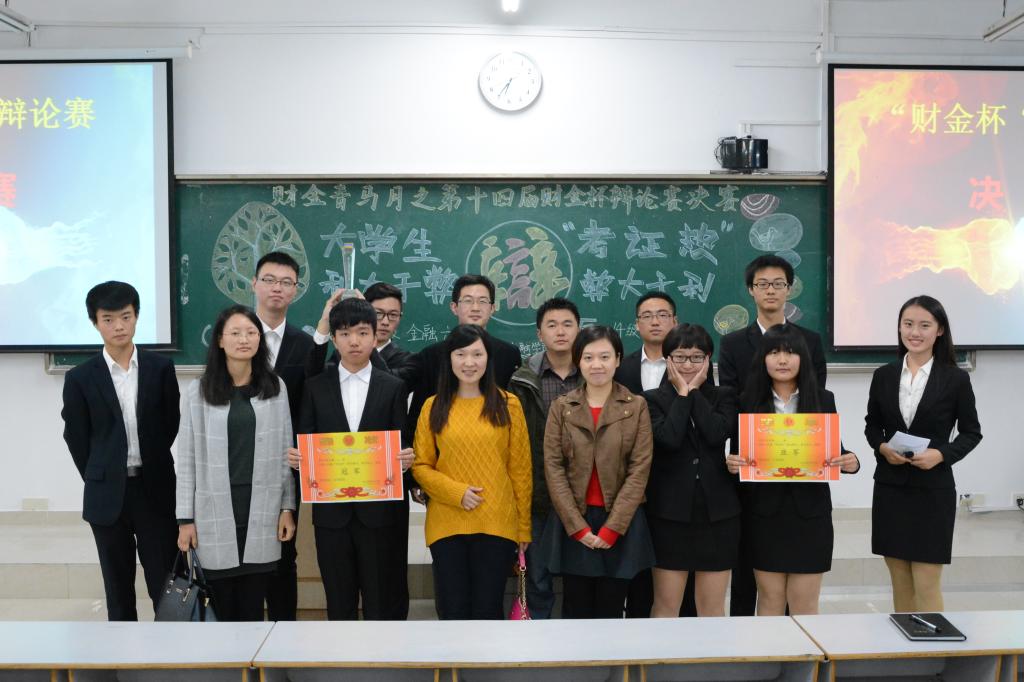 在评委简洁有力的点评之后,徐阔老师对本场比赛做了简短的小结,既表达了对活动参与度的鼓励,也表达了他衷心的祝愿。音乐声响起,比赛进入最激动人心的颁奖环节,范乐乐、余红霞老师为22位同学颁发了“优秀辩手”奖状,观众们亦见证了季军14保险一班和投资一班以及亚军金融二班的荣誉,最终,正方金融六班荣耀折桂,最佳辩手为反方四辩李楠。