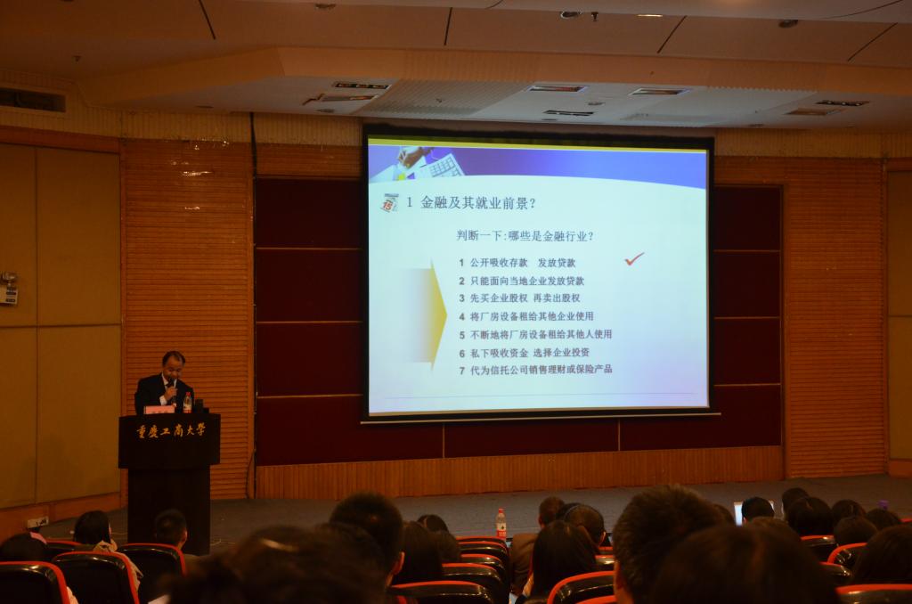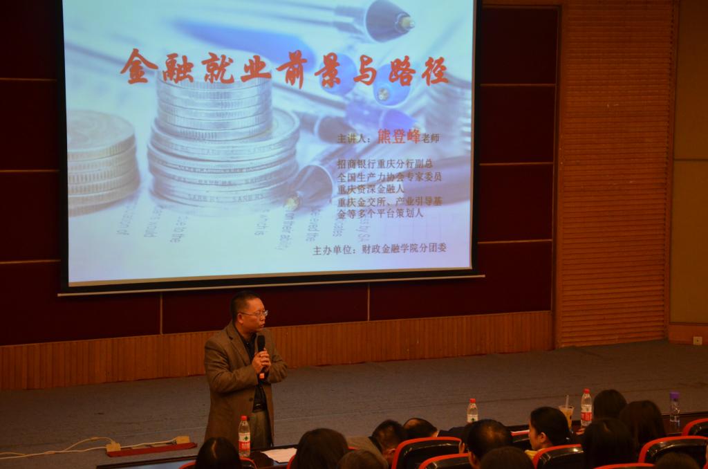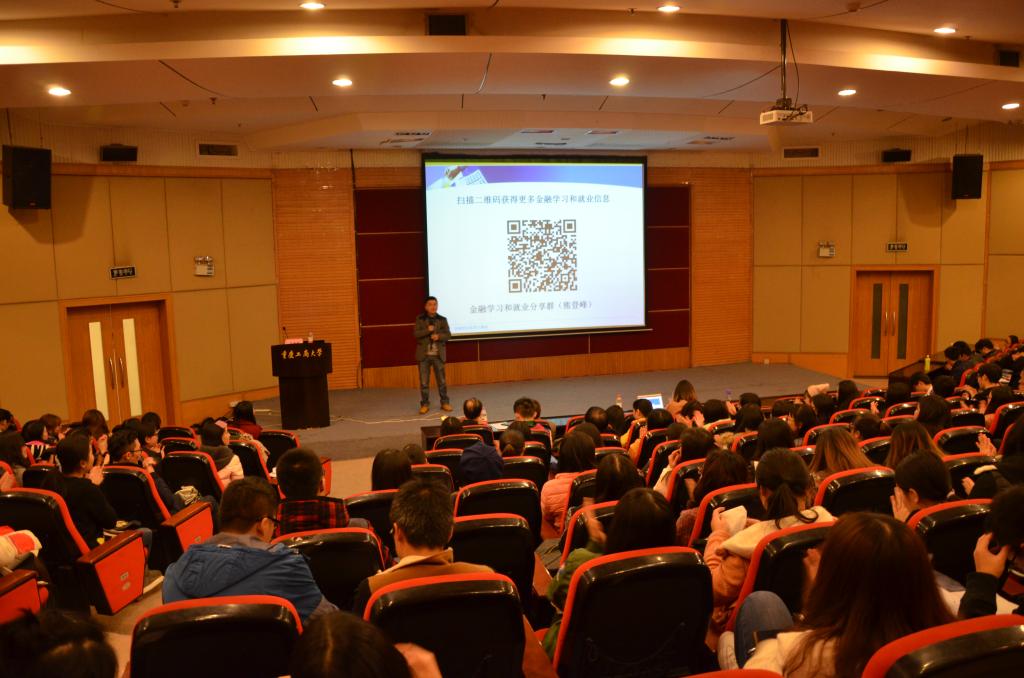 作为全国生产力协会专家委员、重庆资深金融人,熊登峰老师毫无保留地向同学们传授其在金融行业三十几年的经验与收获。他从金融行业良好的发展前景入手,结合公司员工的现状,列举生活化的实例,妙语连珠,娓娓道来。熊老师借助PPT层次分明地剖析了现代金融机构的内部结构,更深入浅出、具体详尽地向同学们介绍了简历设计、面试技巧、口才训练等方面的实用技能。同时,多次和同学们进行互动,活跃现场氛围,牢牢锁住了在场同学的目光。
