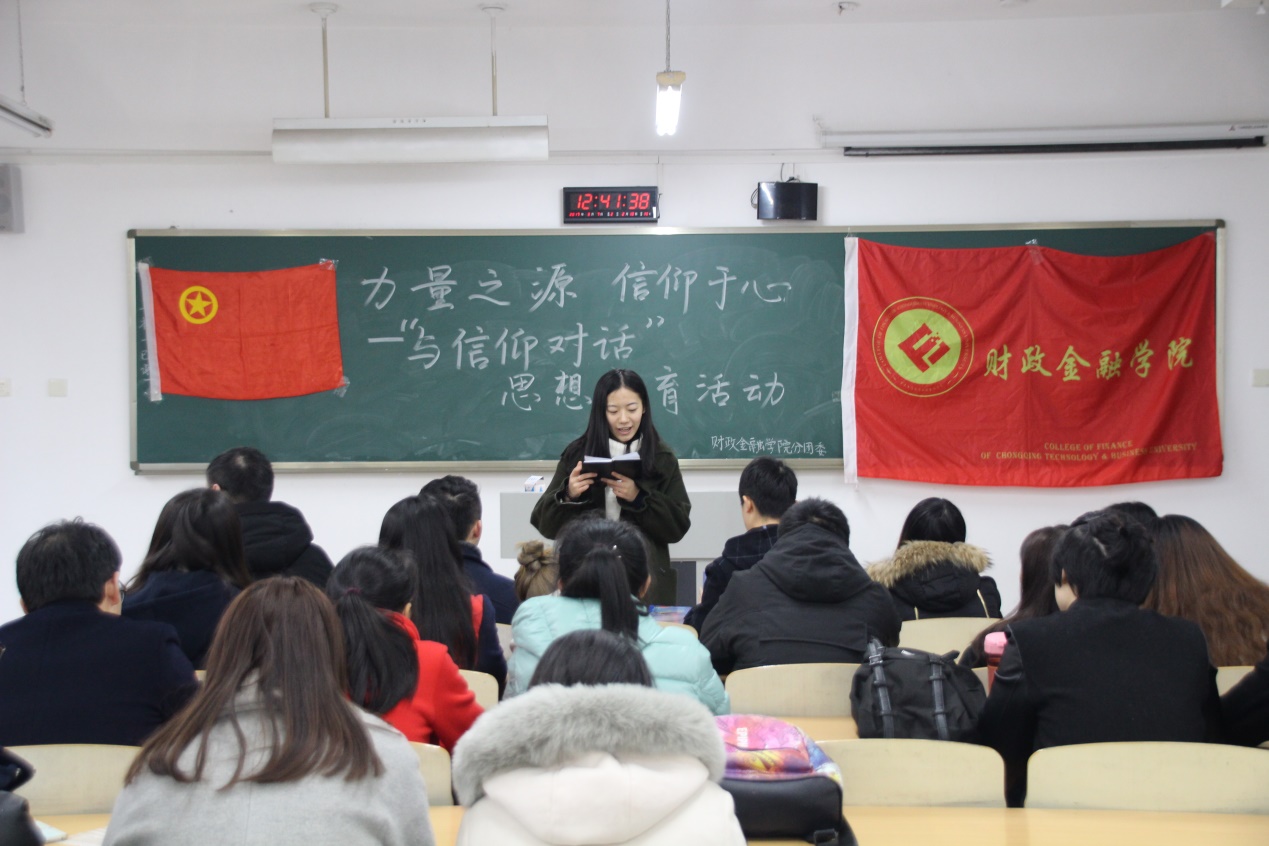2017年3月3日,财政太阳成集团tyc分团委在博智楼212教室举办了以“与信仰对话”为主题的思想教育活动,财政太阳成集团tyc分团委副书记刘玉华向与会的财金公司各团支部书记进行了相关精神的传达及宣讲,公司的团干团员、班级代表积极响应并踊跃参加了本次活动。