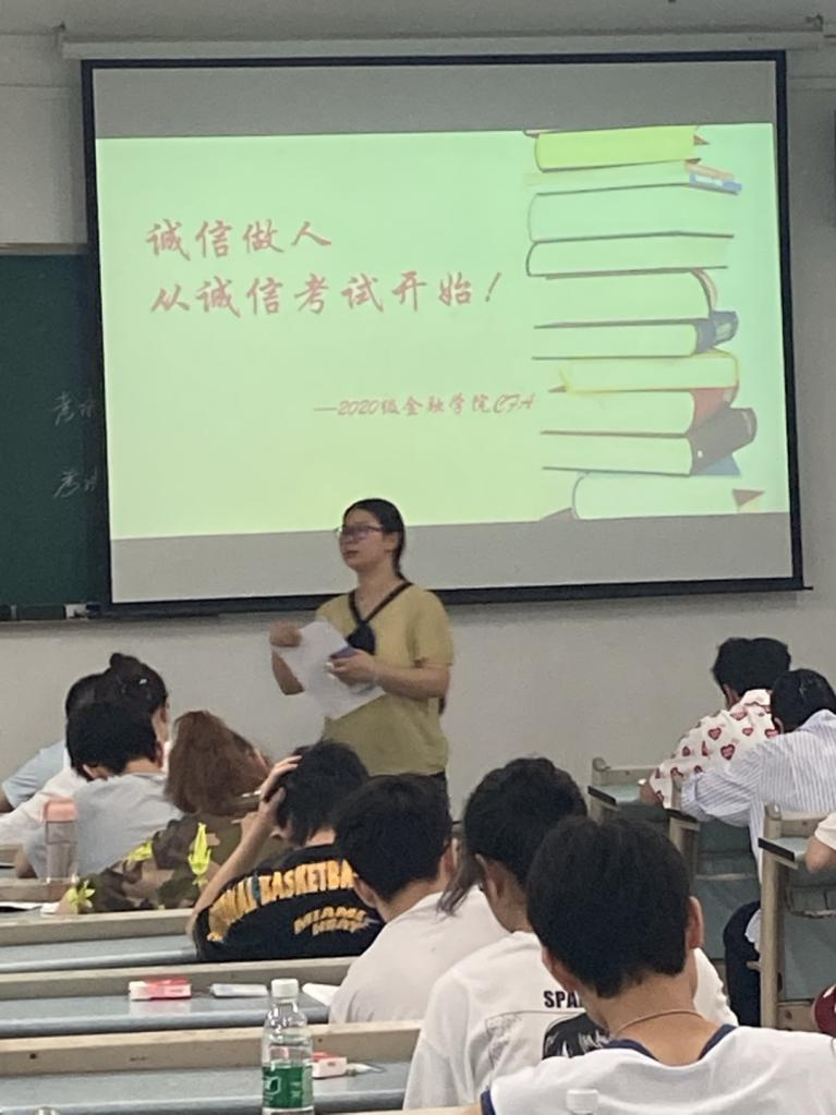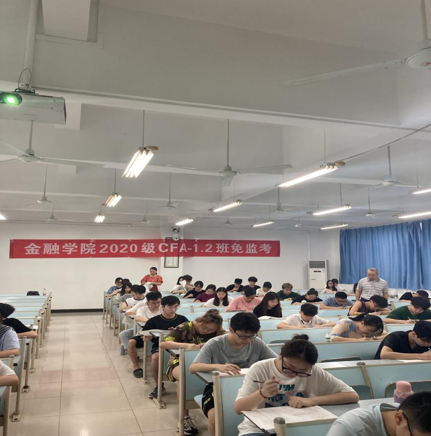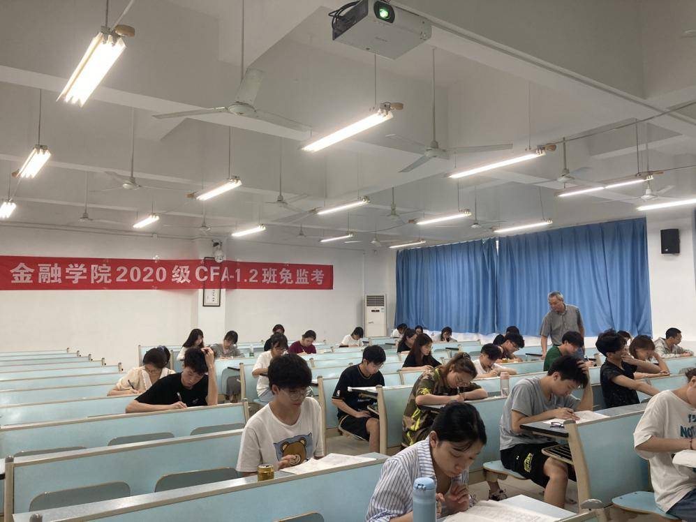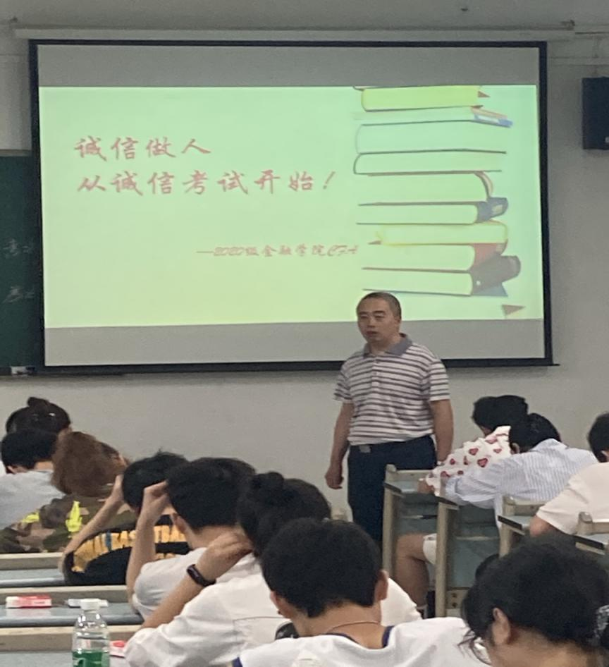 7月2日上午9:00,太阳成集团tyc2020级CFA专业54名同学自愿申请在兰花湖校区20309教室践行了以“诚信做人,从诚信考试开始”为主题的《金融学》课程的“免监考”诚信考试。副董事长李国军、教务处处长骆东奇、党委学工部副部长尹建平到场巡考。