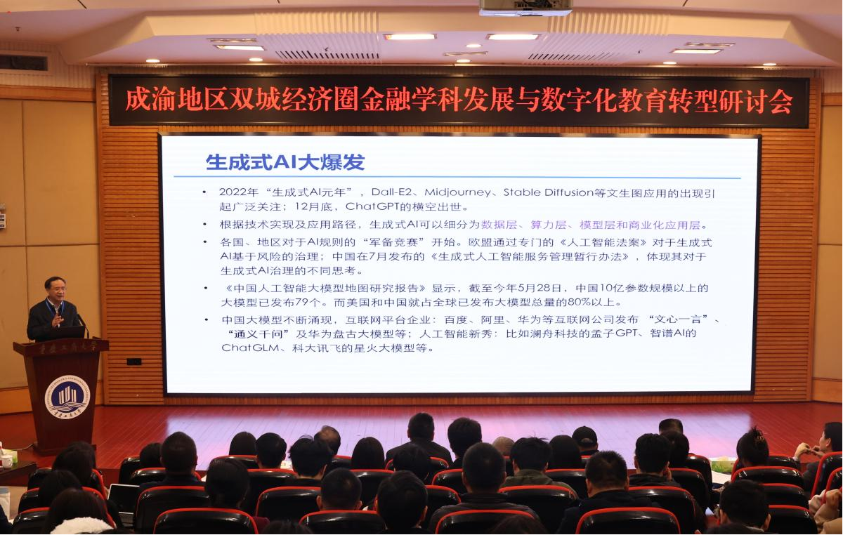 西南交通大学经济管理公司原副经理朱宏泉教授以《大语言模型与金融学研究》为题演讲,从大语言模型的重要性、优势、应用性等角度,分析了大语言模型与金融学的交叉融合的前景。西南大学智能金融与数字经济研究院经理王定祥教授以《金融科技影响下的金融人才培养与学科发展转型思考》为题演讲,从金融行业就业形势、金融科技对人才培养的新要求、金融学科体系构建等方面分析了金融学科教育数字化转型的逻辑和路径。