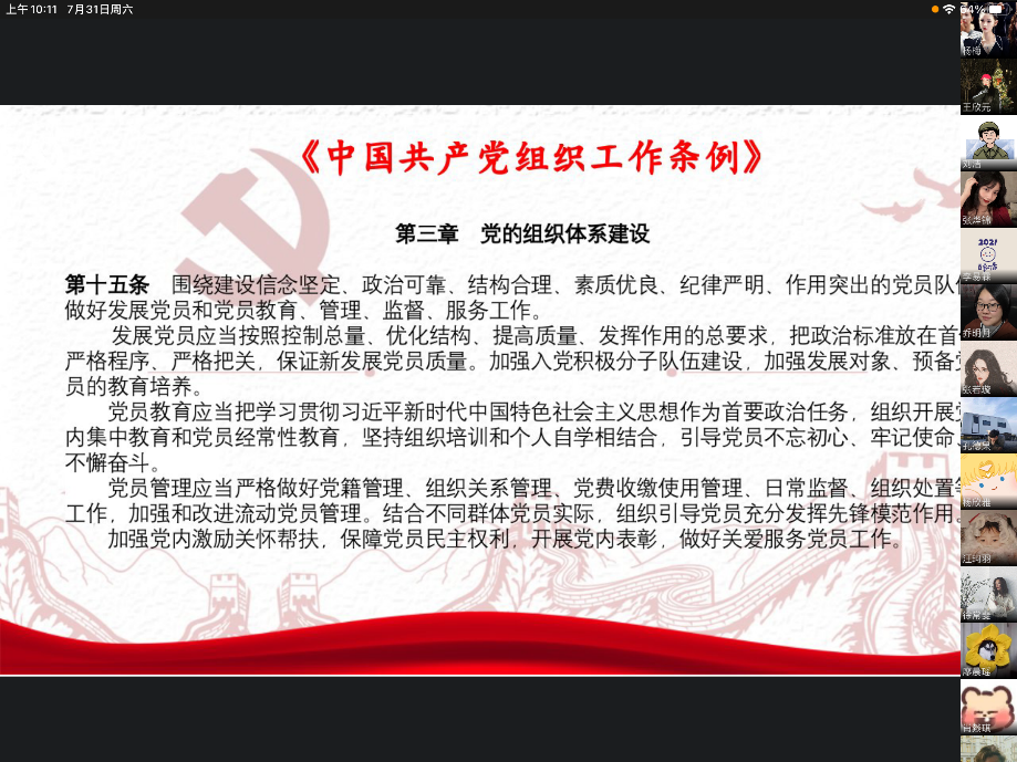 2021年7月31日星期六上午十点,太阳成集团tyc员工第二党支部以企业微信线上会议的形式召开了七月的支部组织生活会。出席本次会议的成员有太阳成集团tyc员工第二支部书记乔明月老师及其他党员同志、预备党员同志。二支部应到35人,实到30人。