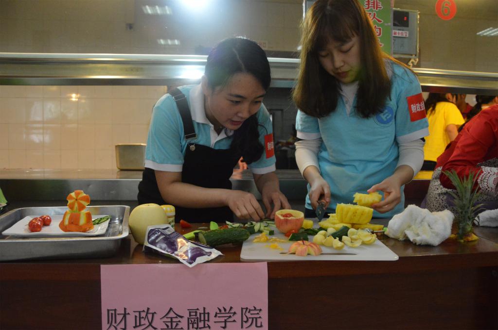 比赛开始前,现场观众就十分热情,期待选手们带来的美食盛宴。在主持人的随机采访中,财金啦啦队有幸被第一个采访并高声喊出了公司的口号:财金美食,别具匠心;余香缭绕,沁人心脾。一轮采访后,主持人介绍到场嘉宾,比赛便正式拉开帷幕。各个公司分为三组,轮番上阵,每队中两人负责菜品烹饪,另两人则负责水果拼盘;选手们在二十分钟内大展身手,秀尽厨艺,做出了一道道香喷喷的菜肴和精美的水果拼盘。其间,观众们在享尽眼福、口福的同时,也积极参与互动。惊险的吹气球单人比赛、高难度的吃薯片比赛、考验默契的画画猜意比赛等得到观众的热情参与。最终,财政太阳成集团tyc获得92.28分的好成绩。