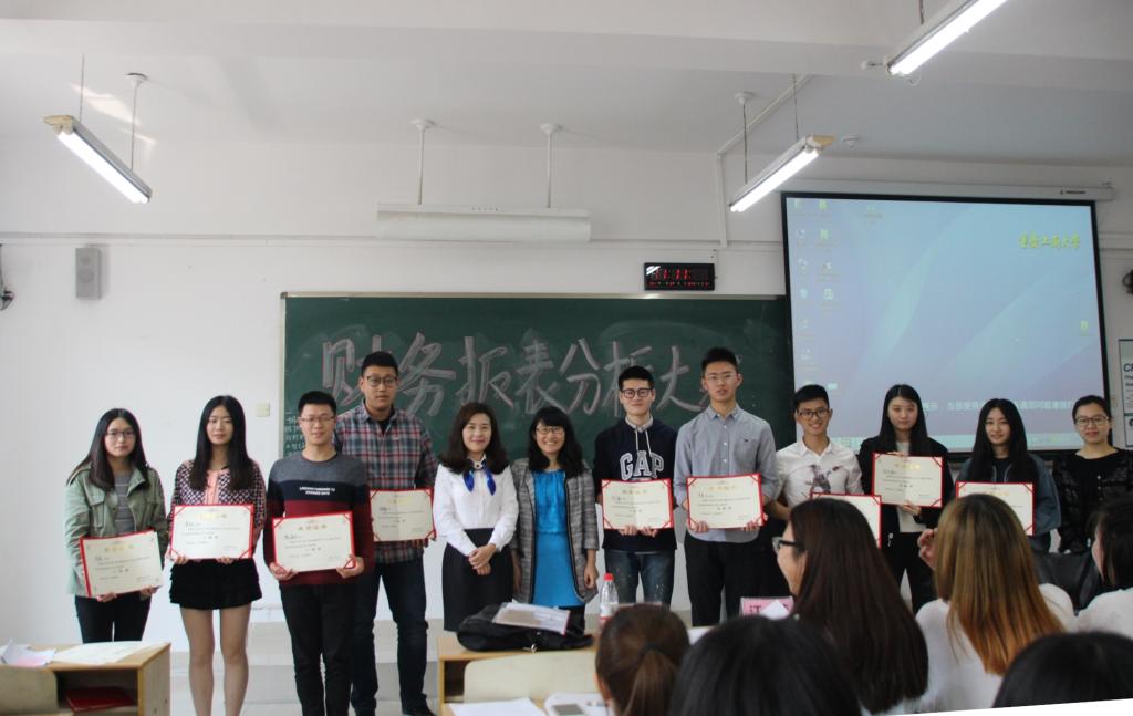 经过了两个小时的激烈角逐,各个奖项尘埃落定,比赛共决出一等奖一个,二等奖两个,三等奖三个。两位评委老师对各个获奖小组亲自颁奖并合影留念。最后大赛评委对此次比赛做出了精辟的点评,对同学们的表现也做出了充分肯定,表示此次财务报表分析大赛与往年相比,同学们作品质量有了提高,比赛内容丰富多彩,各个小组的分析水平都很优秀,不相上下,论证充分合理,有理有据。同时希望财务报表分析大赛能够继续办下去,并且越办越好,更祝愿CFA班同学们学业更上一层楼,成为优秀的金融人才。