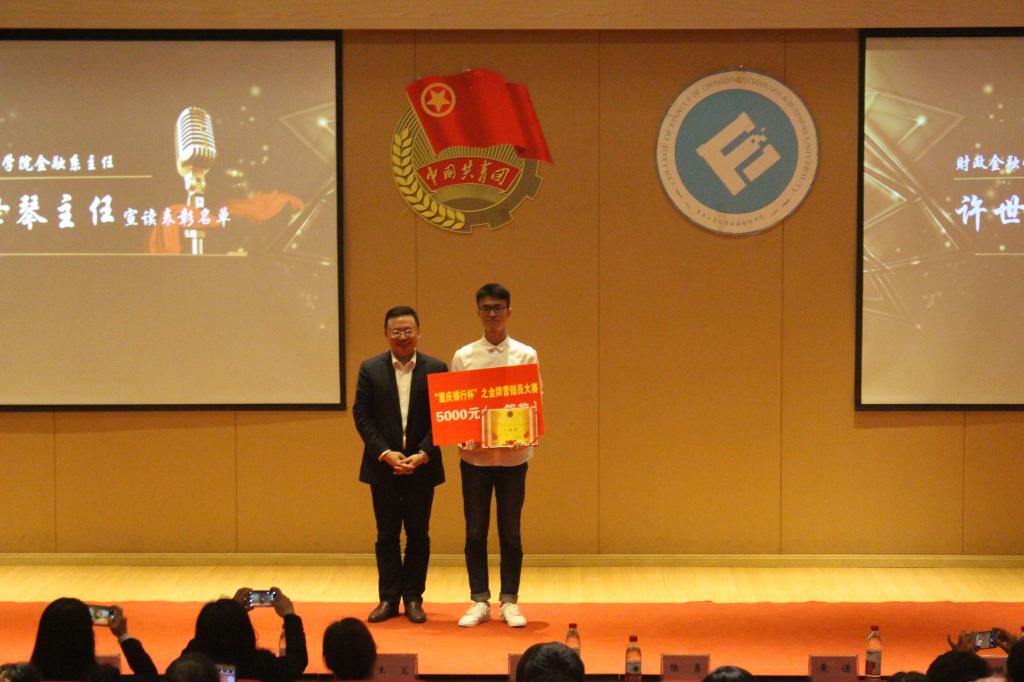 财金舞蹈队以婀娜曼妙的舞姿为大会拉开了帷幕,与会人员一同在总结视频中回顾选手们一路走来的优秀表现与酸甜苦辣,三个月的营销历程历历在目。随后,公司党委副书记黄谦发表讲话,表达了对重庆银行以及公司各领导大力支持的感谢,祝贺参赛选手在比赛中取得优异成绩,他还强调此类学科竞赛为公司金融专业的长足发展有重要意义;随后,陆勇先生在发言中肯定了重庆银行与财金公司架构实践桥梁的意义并对各参赛选手在重庆银行各营业网点的优异表现给予高度评价,感谢他们的辛勤付出为重庆银行年度业绩奠定了良好基础。在激动人心的颁奖环节,况娴、周悦等10名同学获得优秀奖;曾永家左、秦雨凡、蔡进获得三等奖;李璨婷、幸夕获得二等奖;杜朝阳凭借出众的营销技能和坚持不懈的精神勇夺大赛冠军。