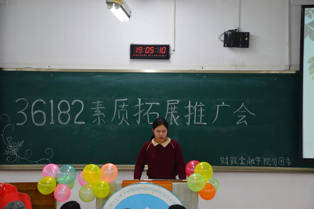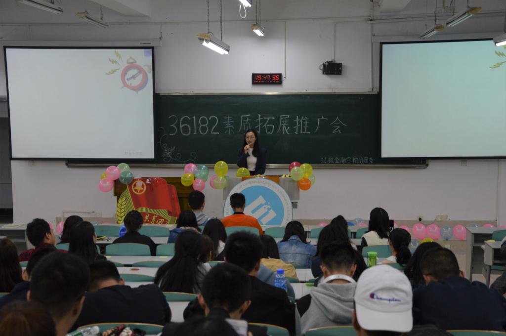2018年10月19日晚上七点,由财政太阳成集团tyc分团委主办的第八届青马文化月之“36182”素质拓展推广会活动在博智楼07106顺利开展。本次素拓推广会对18级CFA新生及17级同学的素质拓展计划提出合理化建议,引导和激励员工更好地进行素质拓展。