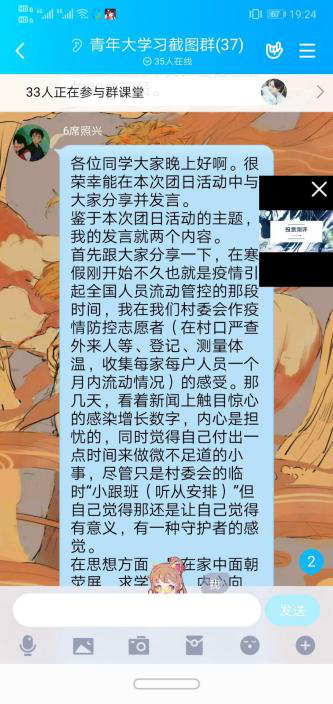 2018 级金工二班团支部通过两名志愿者分享了自己在乡镇内担任志愿者服务期间的所见所想还原了抗疫工作时的“守护者”精神,尽管工作不算繁杂但是也是在为这场人类与病毒的战役,用不断增长且触目惊心的数字激励着自己坚守岗位,勉励了同学们星星之火可以燎原,人类团结起来一定能打败作为唯一对手的病毒!