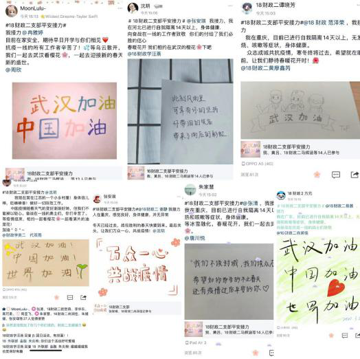 2018 级财政二班团支部通过学习习近平总书记在中央政治局常委会会议研究应对新型冠状病毒肺炎疫情工作时的讲话,领会习总书记的重要指示精神,坚定同学们必胜的信念,打好疫情防控狙击战。全体同学发起 QQ 空间说说报平安活动,带上#18 财政二支部平安接力#的话题标签,并附上自己手写的加油祝福语图片,@QQ 好友接力。不仅在班级内部起到了警示作用,也在每位同学不同的社交圈内提醒了其他朋友们要保护好自己,少出门、尽量宅家。