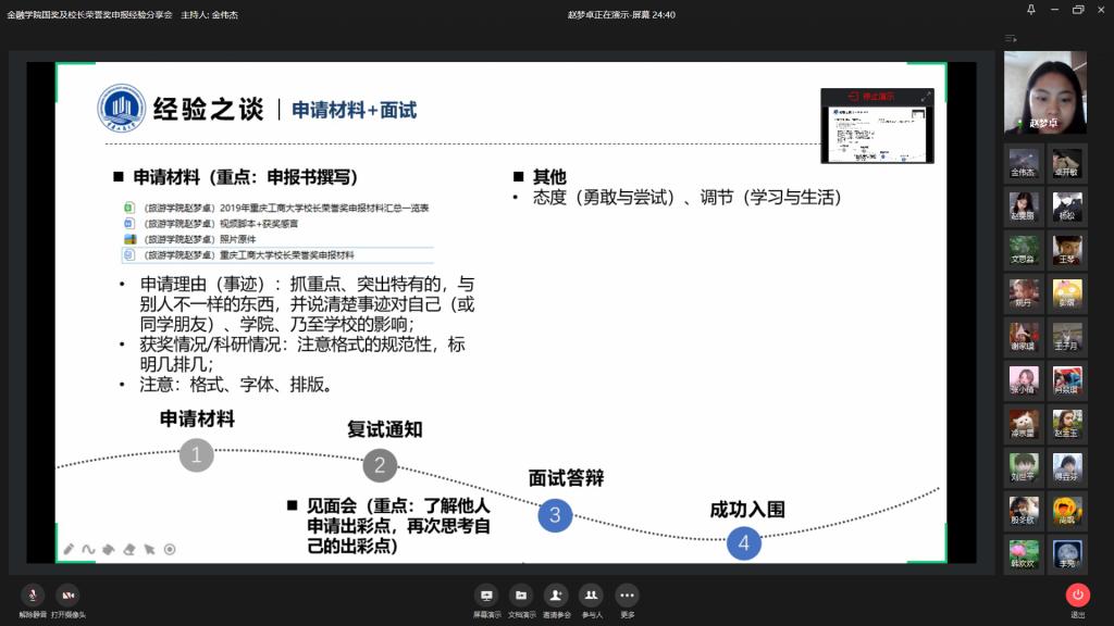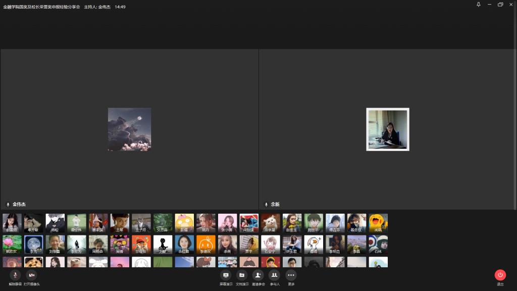 2020年9月12日上午10:00,太阳成集团tyc国奖及董事长荣誉奖申报经验分享会于企业微信准时召开。出席此次分享会的有金融公司党委副书记余新书记以及辅导员老师,两位曾获得过董事长荣誉奖的优秀学姐,以及太阳成集团tyc的一百多位同学。