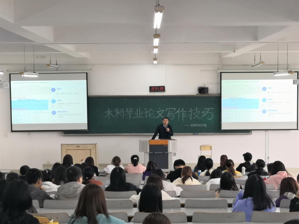 在“本科毕业论文写作技巧”讲座中,王老师据论文写作问卷调查中所反映出的问题,从参考文献的正确标引和论文的写作规范两方面进行了详细讲解。首先,王老师通过对百度和专业数据库的信息对比,指出在专业数据库查找论文资料的必要性,指明挑选阅读文献时应注意的要点,提醒同学们要着重关注文献的影响力、权威性、新颖性和独特性,筛选高质量、有效用的参考资料。随后,王老师以一篇高质量的毕业论文为范本,为同学们总体介绍了论文的结构:题目、摘要、关键词、引言、主体、结论、参考文献。最后,王老师具体指出每一结构中需注意的论文写作规范,特别强调选题要抓住当下热点、难点和焦点,论文主体要图文并茂、论证清晰。王老师深入浅出、条理清晰的讲解,让在场的同学们受益匪浅。