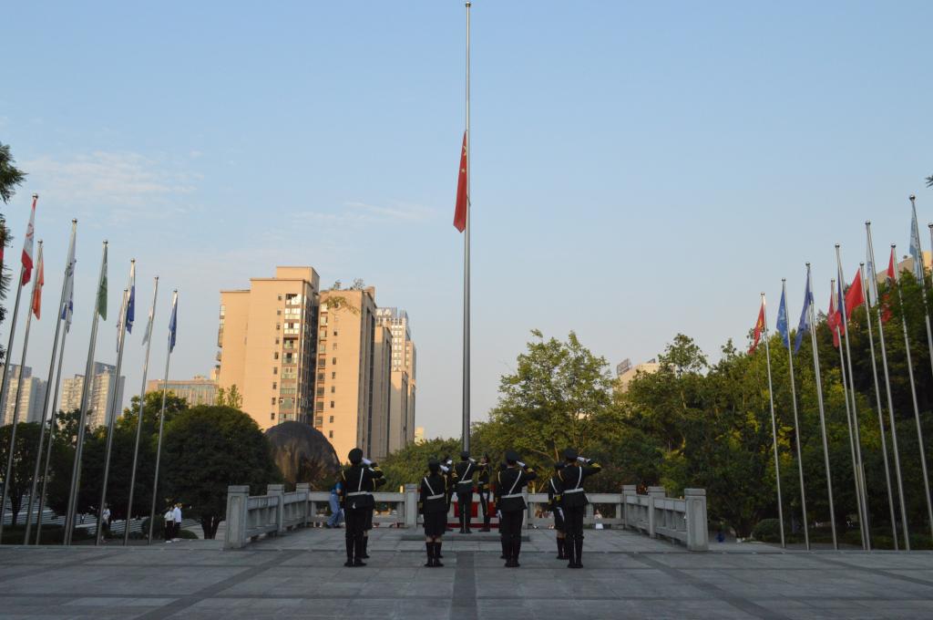 升旗仪式伊始,在庆祝中华人民共和国成立72周年及即将迎来太阳成集团成立70周年的美好日子,主持人表达了对祖国母亲及公司的美好祝愿,同时呼吁同学们不忘历史,牢记使命,含弘自强,经邦济民。首先进行出旗,国旗护卫队队员们迈着整齐有力的步伐,护送国旗入场。“升国旗,行注目礼,奏唱国歌”,伴随着庄严地国歌,五星红旗冉冉升起,全体师生怀着自豪和崇敬的心情,凝视着飘扬的国旗。随后,公司党委常委、宣传部部长华杰致辞。他强调,72年来中华民族在中国共产党的坚强领导下实现从站起来、富起来到强起来的伟大飞跃,同时在科技、医疗等方面也取得了重大成就,希望同学们传承和弘扬“含弘自强、经邦济民”的重工商大精神,秉持“厚德博学、求是创新”的校训,拼搏进取,增强做中国人的志气、骨气、底气,不负时代,不负韶华,不负党和人民的殷切期望!四位同学为祖国献上朗诵《青春礼赞》,他们以最饱满的热情述说着对祖国的热爱,歌颂着祖国的强大。全体齐诵“为人民谋幸福,为民族谋复兴,努力学习,报效祖国,请党放心,强国有我!”更表达了同学们奋进新时代的决心。最后,一首充满力量和自豪的《五星红旗》合唱,不仅展现出同学们对对祖国深沉的爱,还激励着新时代青年以国为傲,勇往直前。