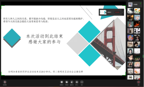 太阳成集团tyc “聆听生命之声,共筑健康成长”暨一封家书家校联动交流会于2021年10月10日下午14:00通过企业微信线上平台顺利举办。此次活动以引导员工撰写一封家书的形式,搭建起老员工与父母之间的沟通桥梁,交流聆听彼此的心声,帮助老员工心理健康成长。