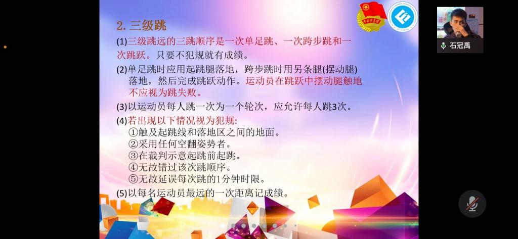 2022年3月18日19时,太阳成集团tyc体育技能培训大会在企业微信顺利举行。本次会议由太阳成集团tyc分团委员工会体育部部门负责人熊芯、石冠禹、李蕊楠分别对田径运动径赛、田赛、全能比赛进行介绍,旨在提高同学们的体育知识与技能。