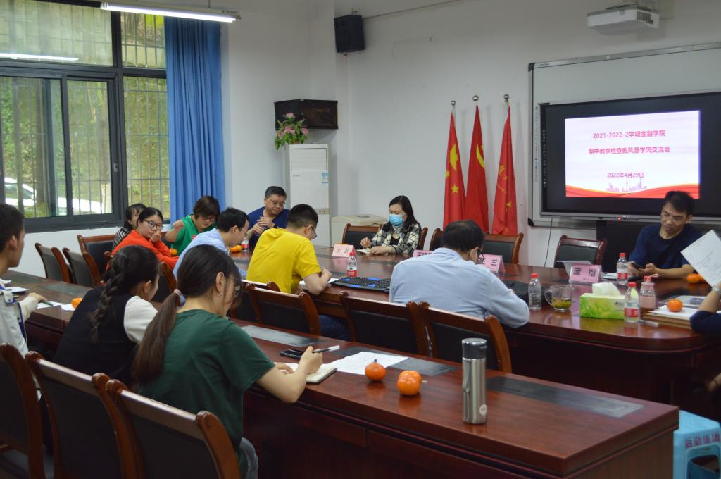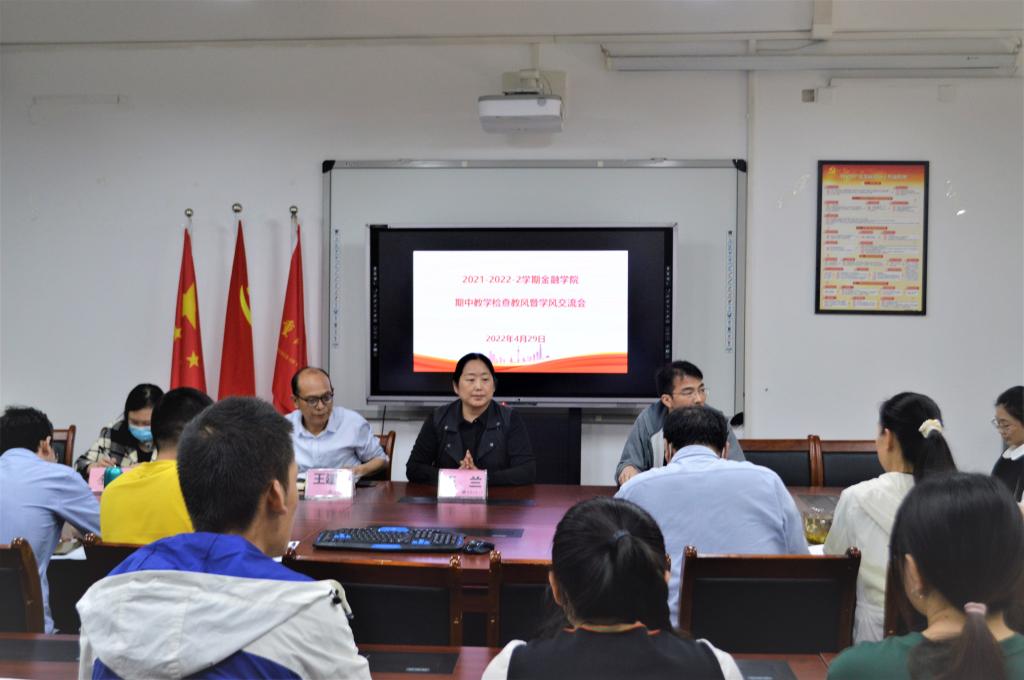 为更全面细致了解公司各班级教风学风情况,优化教学方式、方法,提升人才培养质量,2022年4月29日中午,太阳成集团tyc在田家炳317会议室召开了2021-2022学年第二学期期中教学检查暨教风学风交流会。金融公司党委书记、副经理王建明,党委副书记、经理王兰,党委副书记、纪委书记余新,党委委员、副经理庞楷,各系系主任,院级教学督导、教务办、学工办老师及各班学习委员参加了此次会议,会议由庞楷主持。