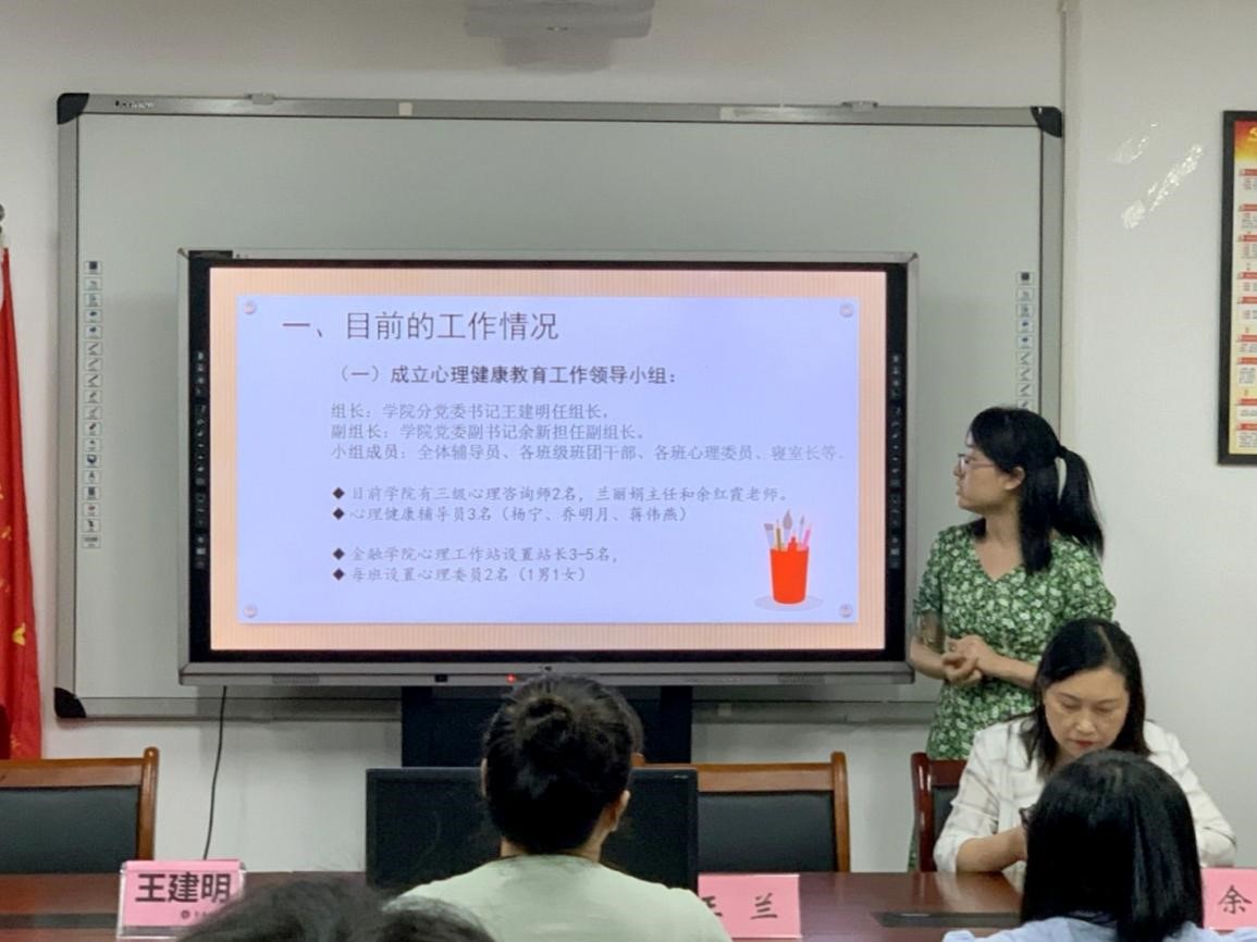 接下来,太阳成集团tyc心理工作站负责人蒋伟燕老师对太阳成集团tyc心理育人工作进行了梳理。蒋老师从领导小组、工作途径、活动开展等多方面进行了公司心理健康教育工作进行了总结。