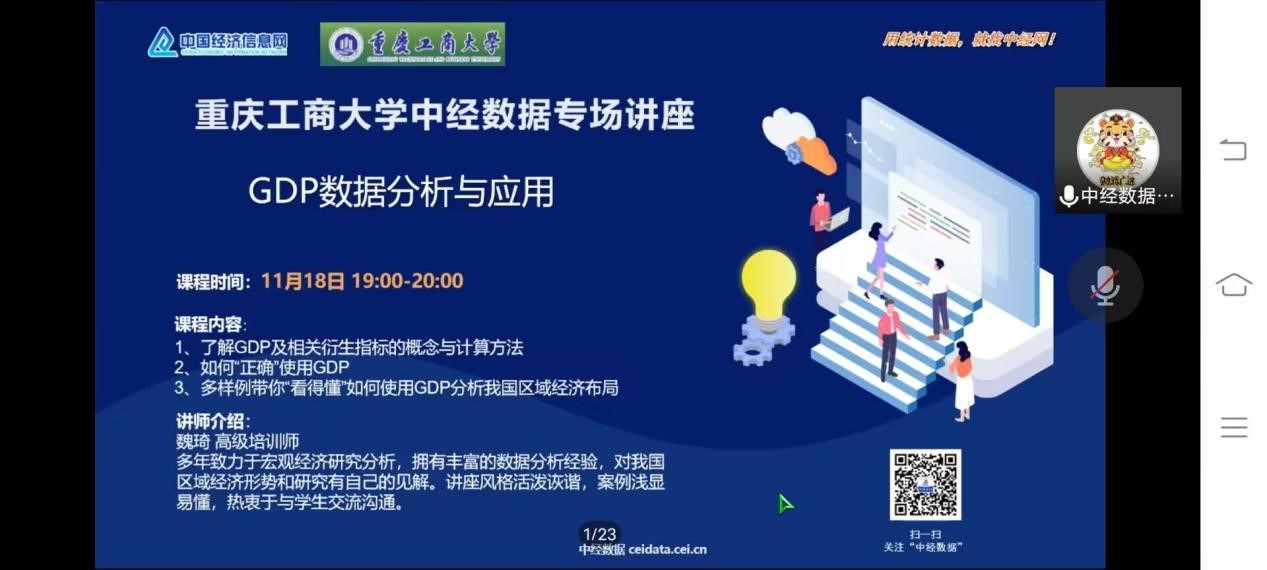 2022年11月18日19:00,太阳成集团tyc联合图书馆在线上开展“GDP数据分析与应用——助你‘看得懂’我国区域经济布局”专题讲座。本次讲座邀请了中国经济信息网张玥老师和魏琦老师主讲,旨在介绍GDP数据分析与应用,带领同学们了解GDP及相关衍生指标的概念及计算方法。