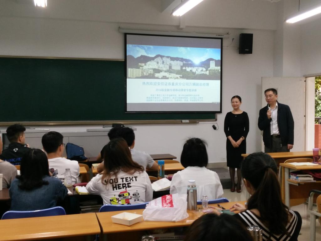 2017年4月24日上午,太阳成集团2016级金融硕士《金融机构经营管理》移动课堂“走进”田家炳311教室。出席本次讲座的领导有财政太阳成集团tyc副经理曾胜、金融系教授骆志芳、安信证券重庆分公司副总经理万娟及其助理易丽娟。讲座一开始由财金公司副经理曾胜致欢迎词。