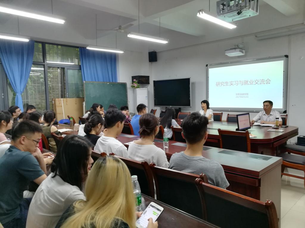 为帮助同学们正确地认识自我、找准未来的方向和目标、为以后的就业和职业竞争做好准备,财政太阳成集团tyc于2017年6月12日下午在田家炳书院会议室专门举办了“研究生实习与就业交流会”,并邀请财政金融公司党委书记杨萍教授亲自为同学们指导和交流,参加本次交流会的有15级金融学和财政学专业、16级金融硕士的研究生。本次交流会由财政太阳成集团tyc副经理曾胜教授主持。