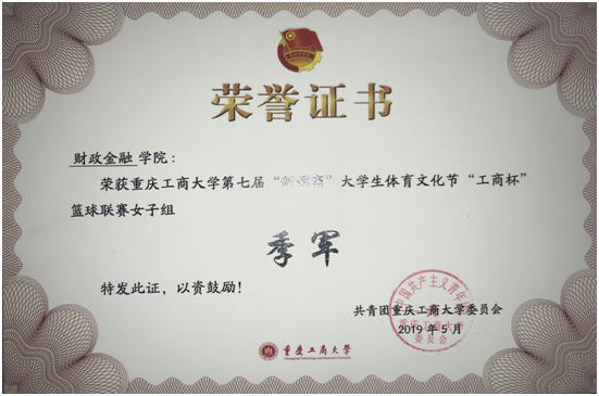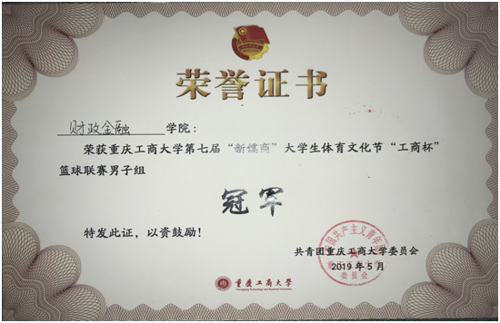 5月31日,由校团委主办、校员工会承办的“工商杯”篮球联赛决赛暨第七届“新儒商”体育文化节闭幕式在南岸校区体艺馆举行。副董事长李国军,体育公司副经理范文杰,校团委副书记杨娟、陆嘉,体育公司体育系副主任、国家级裁判蒋愉出席闭幕式。决赛由公司代表队对战管理公司男子代表队。经过激烈角逐,财金公司男篮队以43-32的巨大优势赢得了本次决赛的胜利,成功夺得本届篮球联赛总冠军,荣获最佳团体奖。此外,财金公司女篮队也荣获女子组季军。