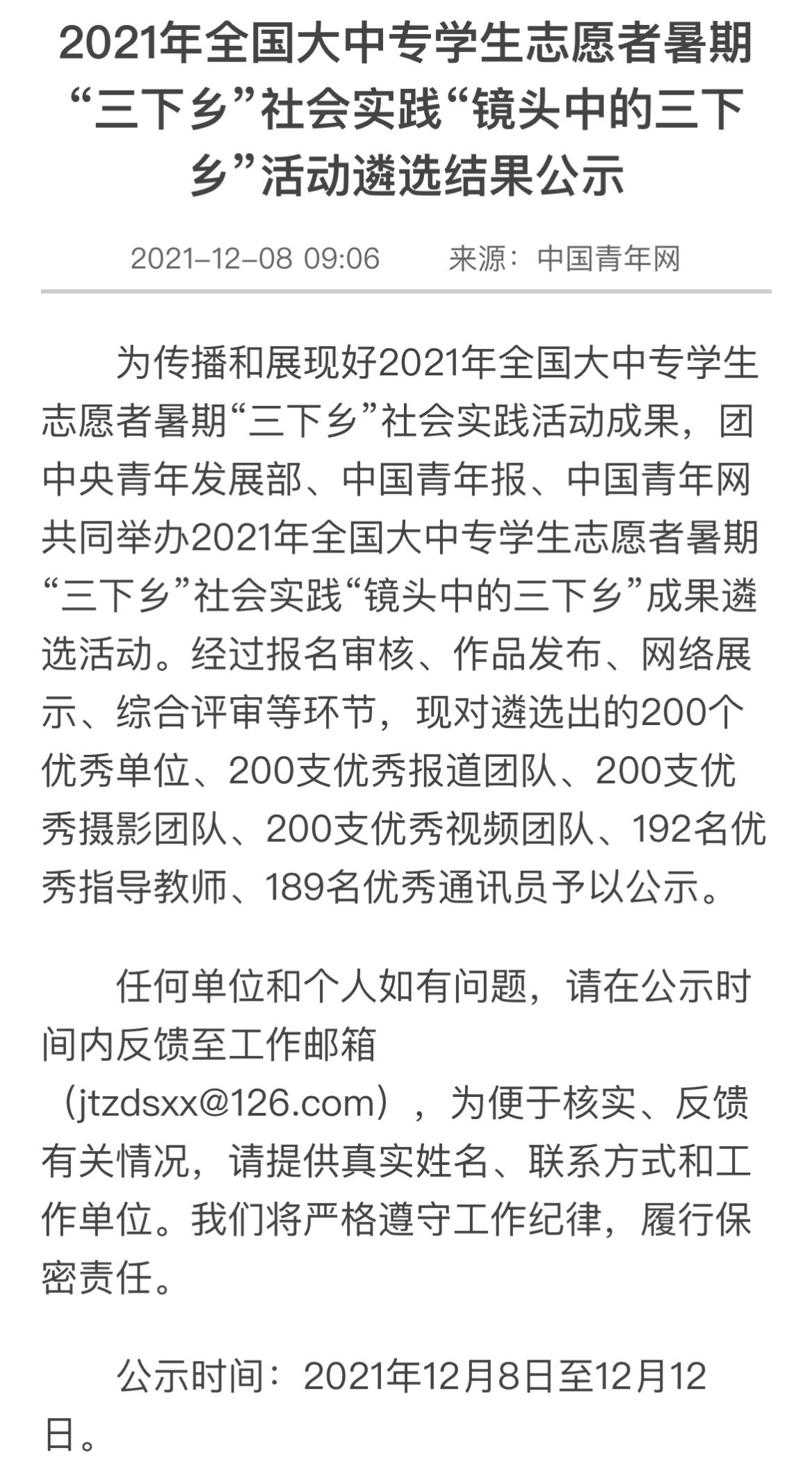 2021年12月8日,团中央青年发展部、中国青年报、中国青年网共同举办2021年全国大中专员工志愿者暑期“三下乡”社会实践“镜头中的三下乡”成果遴选活动最终结果在网络公示。太阳成集团tyc暑期“三下乡”社会实践团队“心系神州事 情融牡丹乡”国情观察实践团荣获“优秀视频团队”称号。
