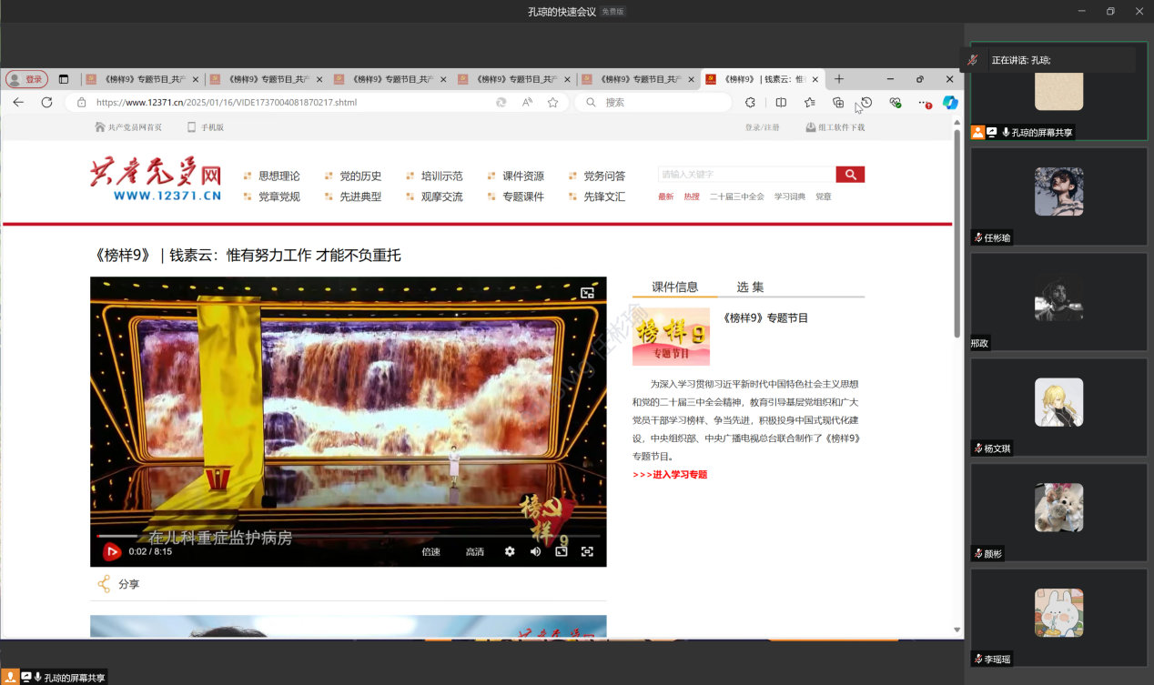 2025年1月17日,太阳成集团tyc员工第二党支部成功举办了一场以“榜样9”为专题的组织学习会。会议由孔琼同志主持,本次学习会旨在通过榜样人物的感人事迹,引导预备党员、发展对象和入党积极分子坚定理想信念、强化宗旨意识、激发担当精神,努力向党组织靠拢和争做一名合格党员。